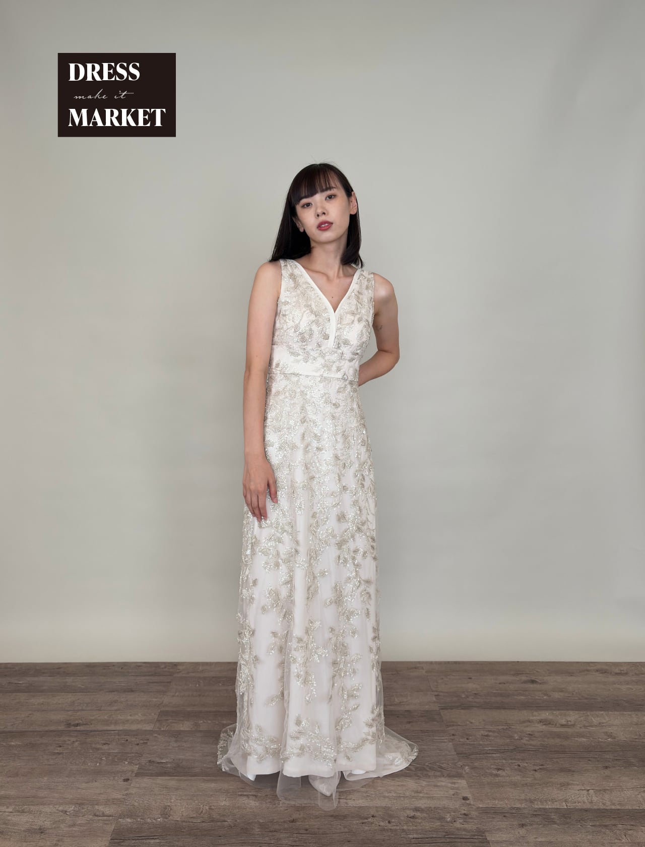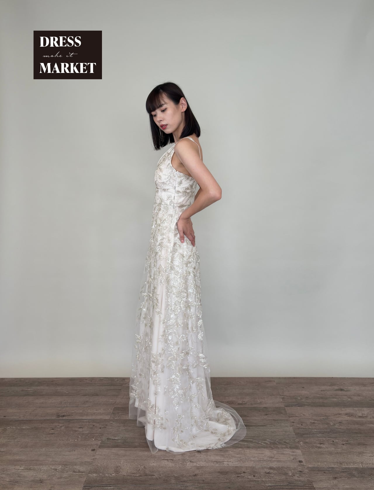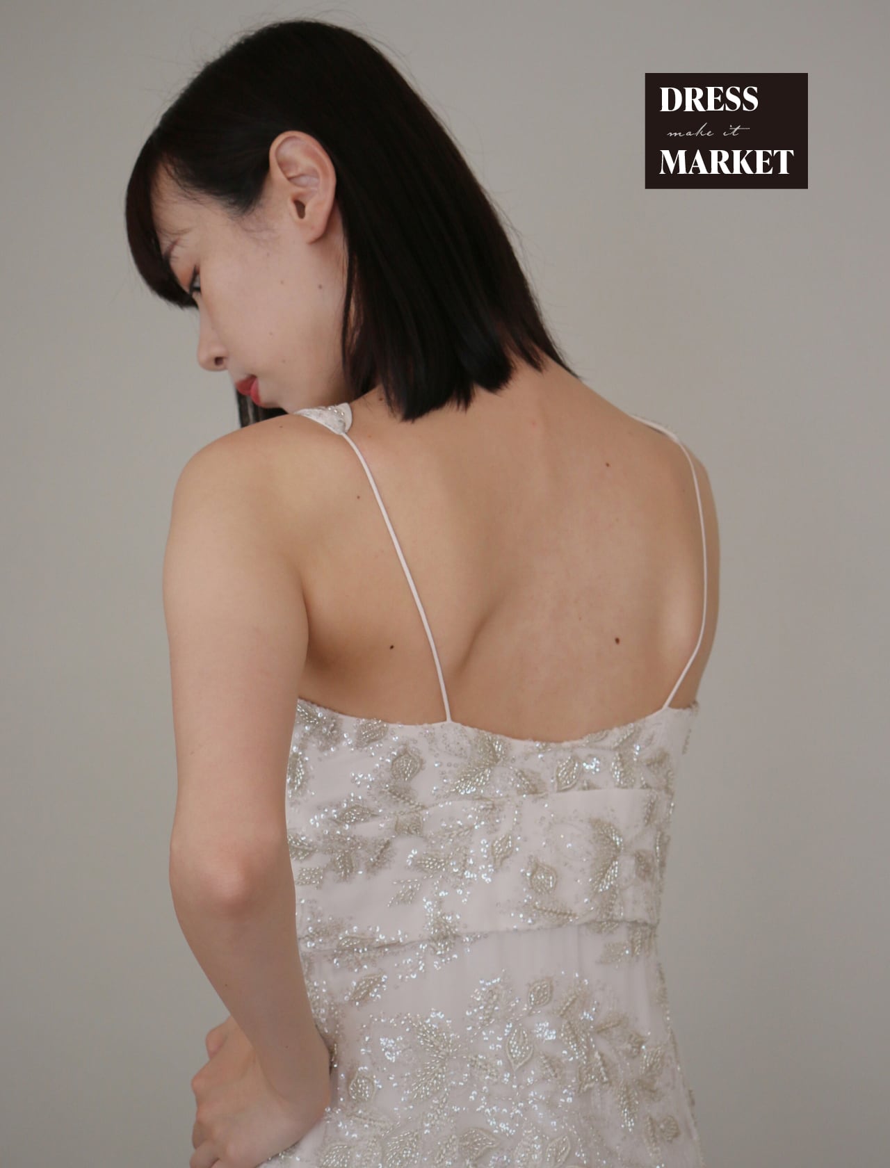 シルバーリーフ柄のビジューレースがエレガントで上品な大人な女性へと導きます。前から見たクラシカルな印象とは対照的に、キャミソールで仕立たバックデザインが女性らしく華やか。サイドファスナーのみで簡単に着用できるのも魅力の一つです。