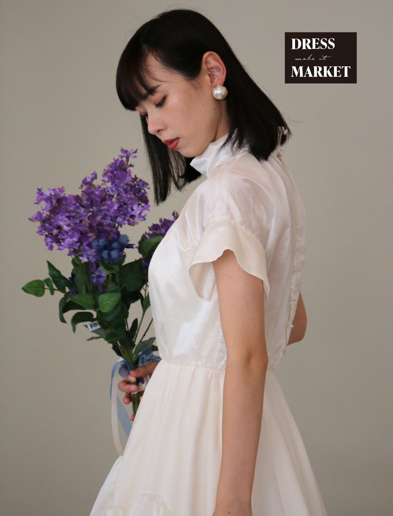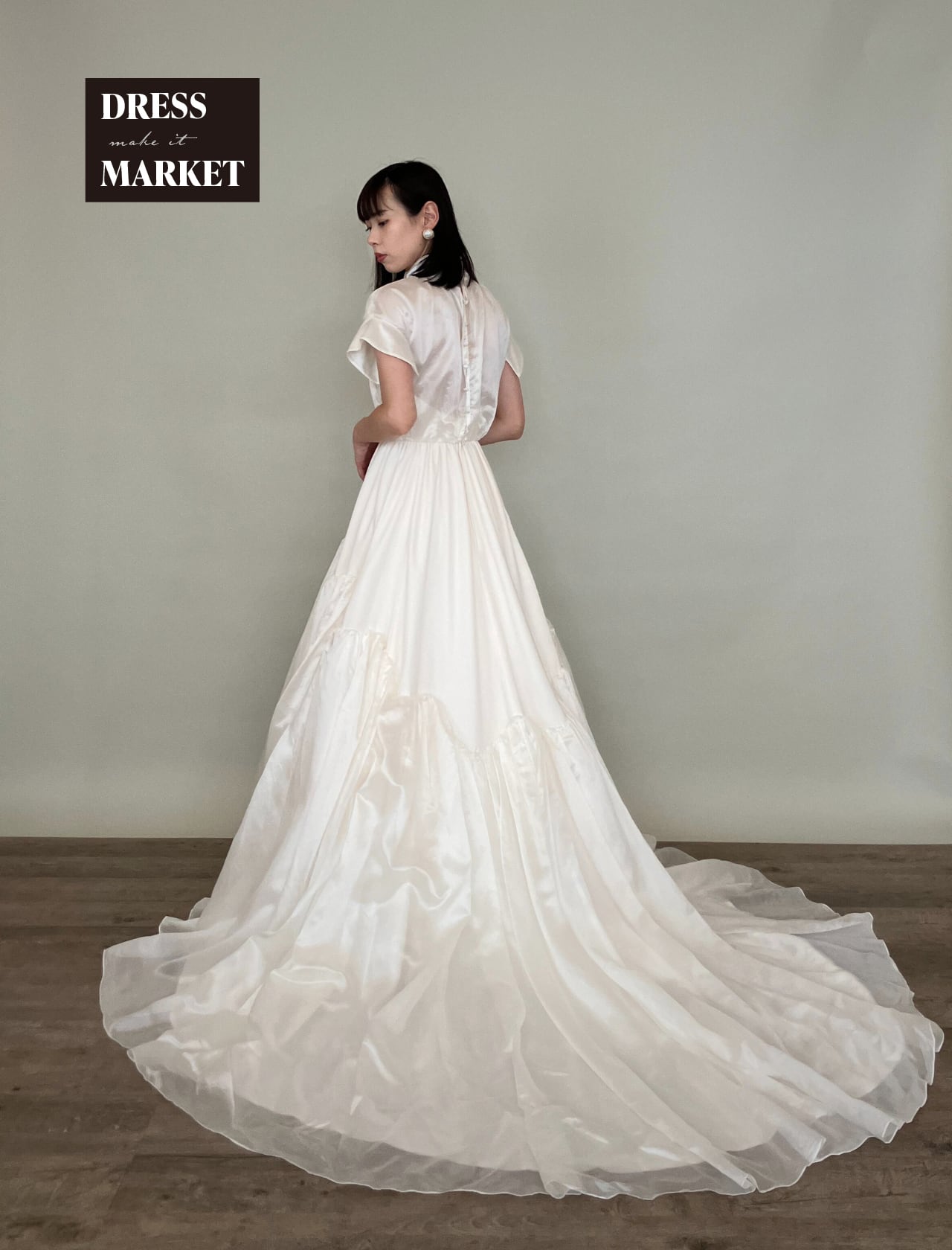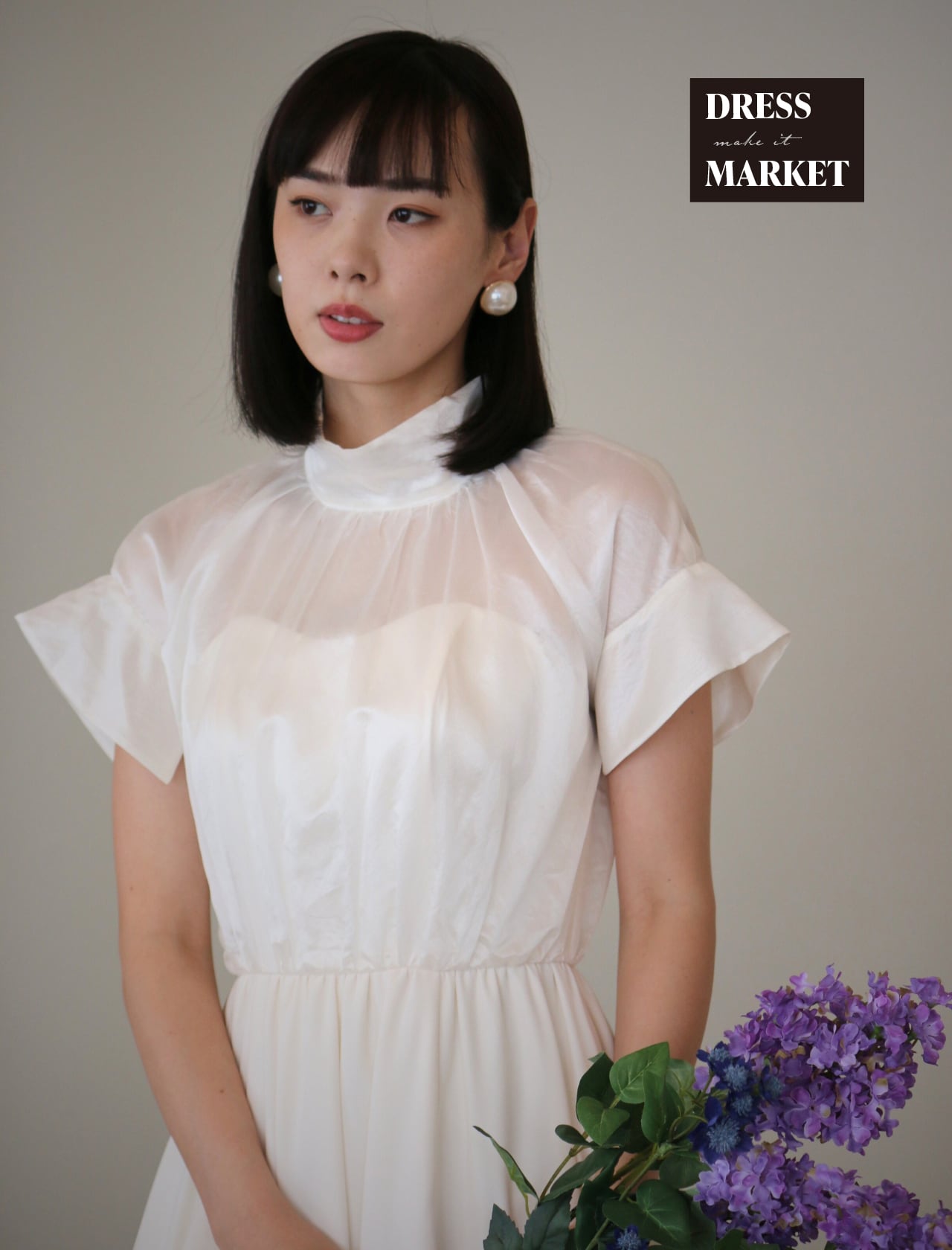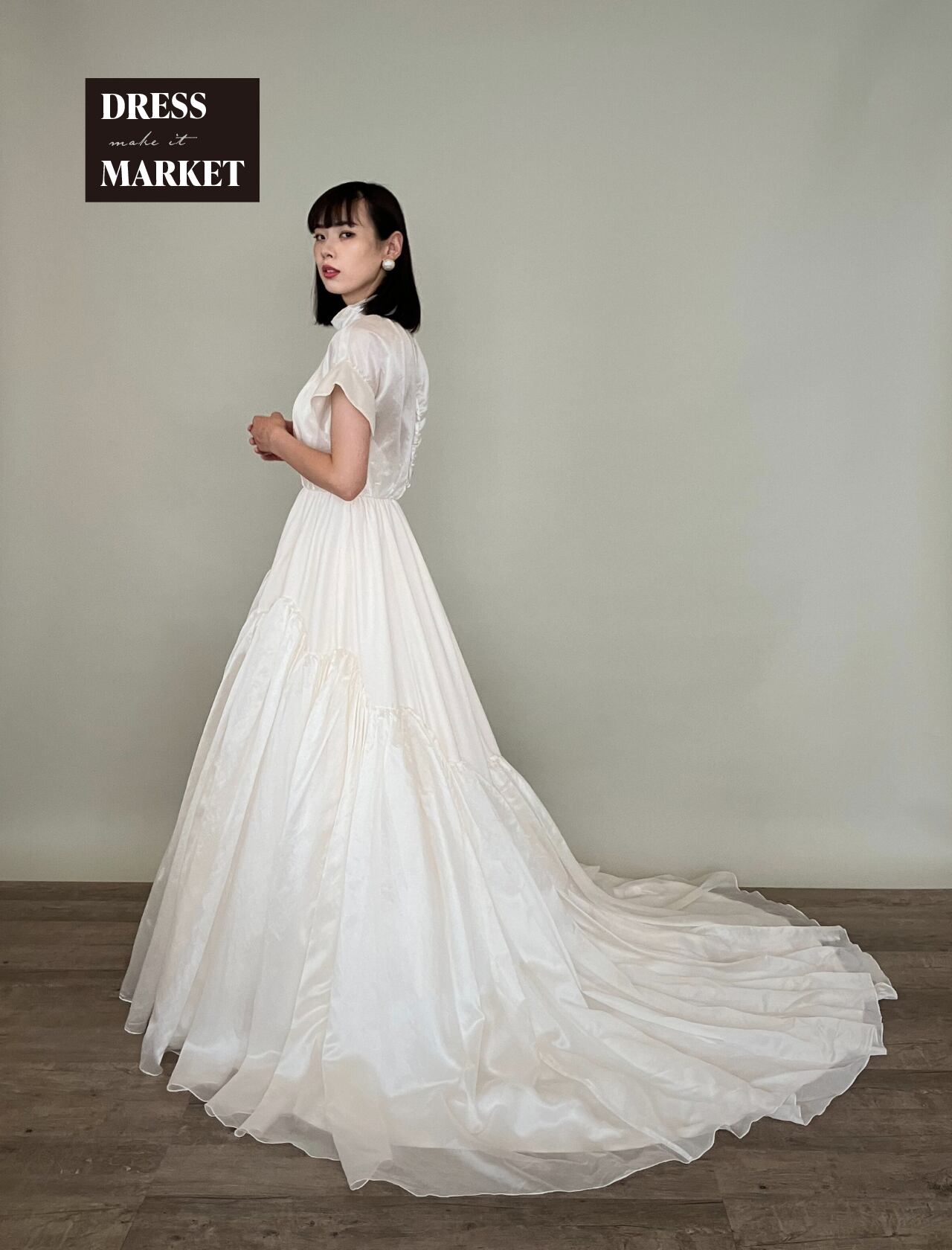 サテンオーガンジーという程よい光沢感と透け感をあわせ持つ上質素材をふんだんに使用したAラインドレス。柔らかく、軽い生地なので動きやすく着心地も抜群。ウェディングドレスでは稀なスタンドカラー&半袖がデイリーファッションを彷彿させる1着です。